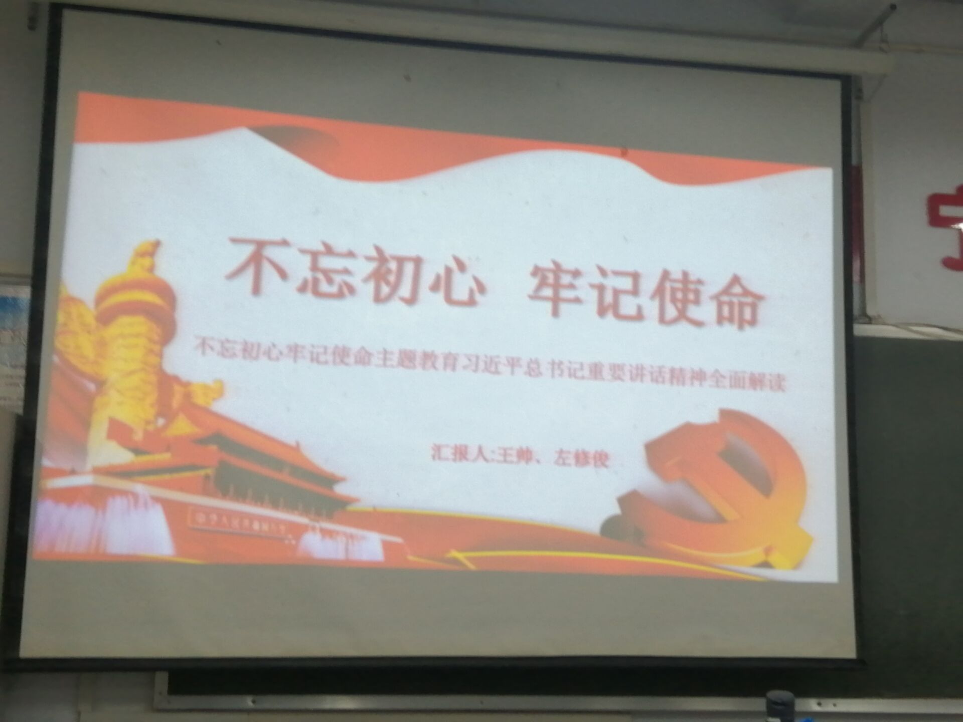本次党课培训分为“不忘初心、牢记使命”的重要意义、目标要求、学习习近平总书记重要讲话、怎样做到“不忘初心、牢记使命”四部分,王帅同志首先点明了“不忘初心、牢记使命”的重要意义,重点讲解了“五位一体”、“四个全面”、“四个意识”、“四个自信”、“两个维护”的重要内容,并提问了同学们对于有关党的重点理论知识的理解和把握。左修俊同志强调了中国共产党的初心和使命,阐明了党同人民的血肉联系,随后同学们就“大学生如何不忘初心、牢记使命”展开讨论并回答了自己的看法。