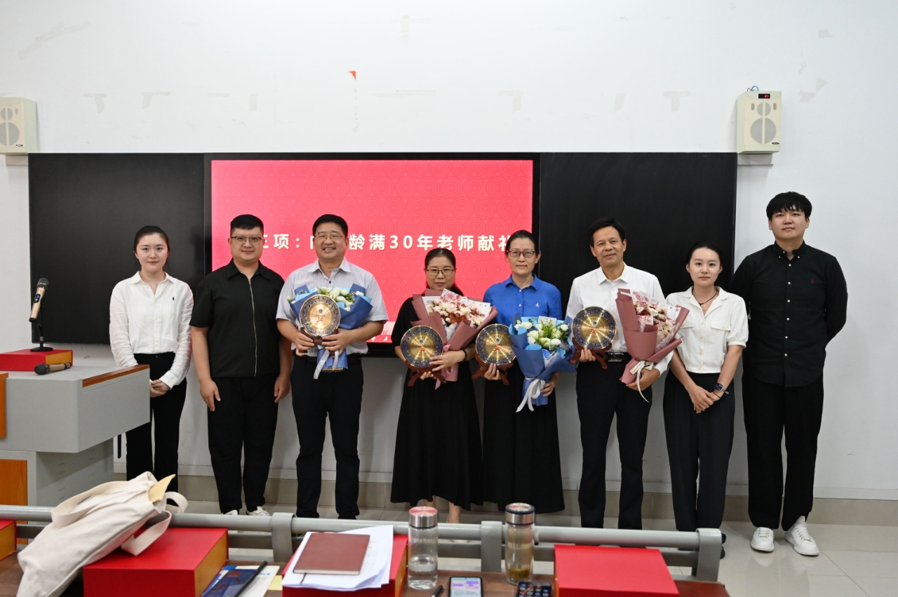 活动伊始,副院长段圣玉宣读了荣休教师和教龄满30年教师的名单。黄春燕、李波、张怒等3位教师光荣退休,田焱、宋明峰、张爱民、郭勇、殷素珍等5位教师教坛耕耘满30年。