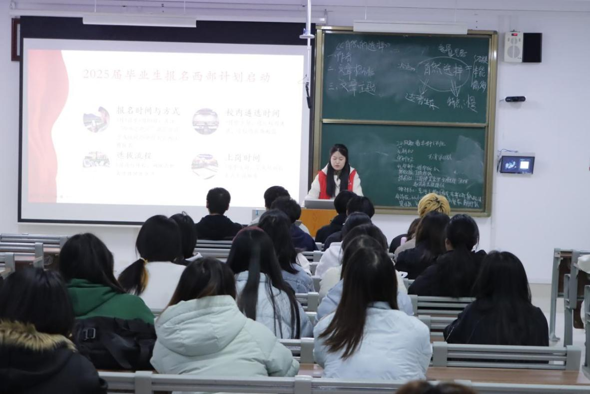 为帮助学生树立正确的就业观念,弘扬志愿服务精神,响应“到西部去,到基层去,到祖国最需要的地方去”的号召,3月13日晚,PA视讯集团网站(传媒学院)组织青年宣讲团深入学生班级,开展“西部计划”专题宣讲活动,通过“政策解读+成长对话”的形式,点燃学子“自找苦吃”的青春担当。