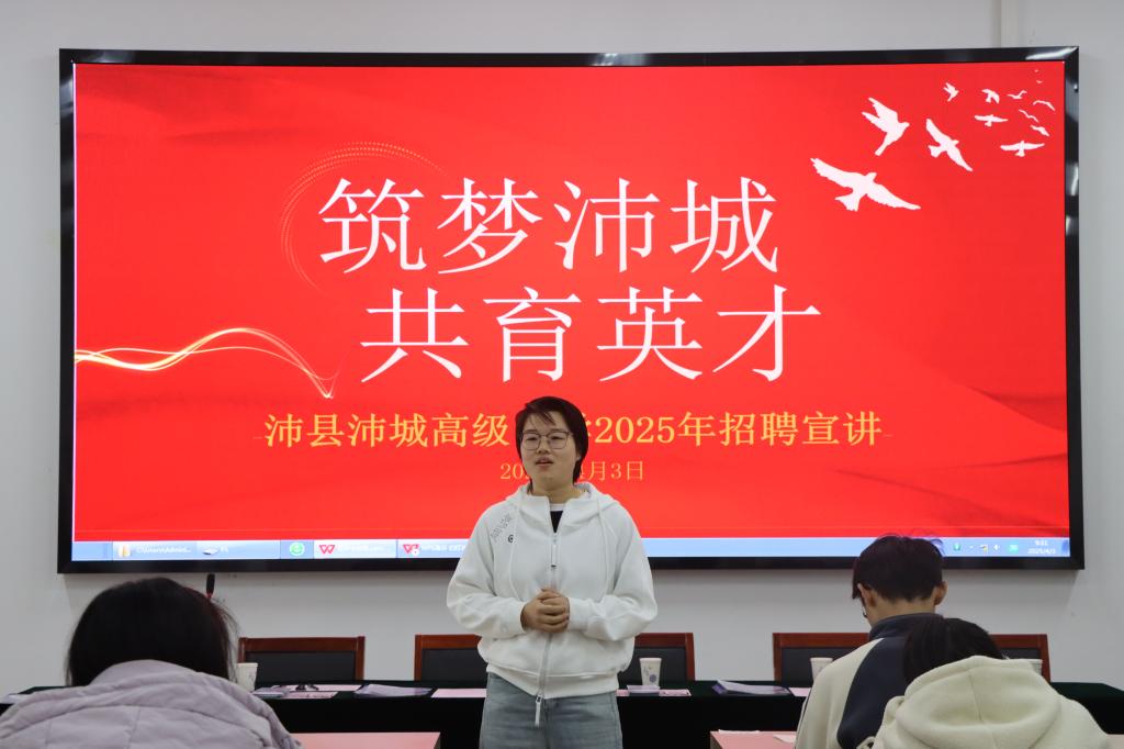 张卫婷围绕沛城高级中学的招聘政策展开宣讲,包括招聘的岗位需求、条件要求以及薪资待遇等关键信息,向毕业生详细介绍了沛城高级中学的办学理念、工作环境、发展路径和福利政策等方面。张卫婷介绍了自己当前的工作状况,深情回顾了当年的校园生活,结合自身在校学习经历和工作实践,激励学弟学妹们勇敢追求梦想,积极提升和充实自己。