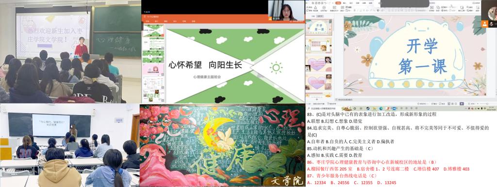 开展心理健康教育宣传系列活动方面。面对新生、“老生”、毕业生不同年级学生特点有针对性地组织开展“心怀希望,向阳生长”等心理健康主题班会。通过主题班会、知识竞赛、黑板报、主题讲座等多种形式线上线下“双线”宣传心理健康知识,引导学生掌握常用的心理调适方法,遇到心理困扰时能够进行自我调节。