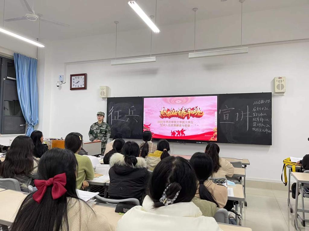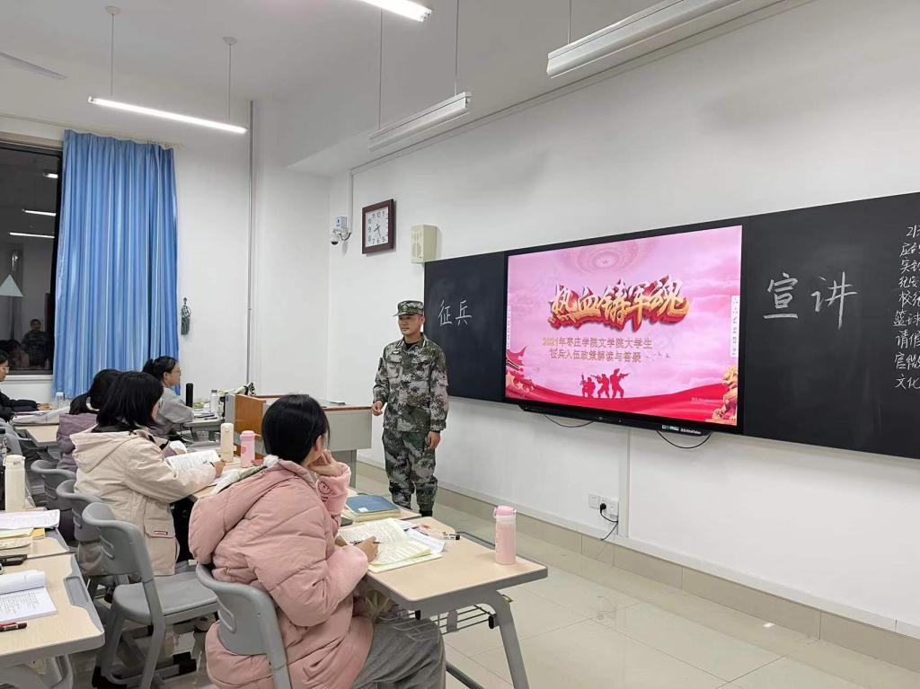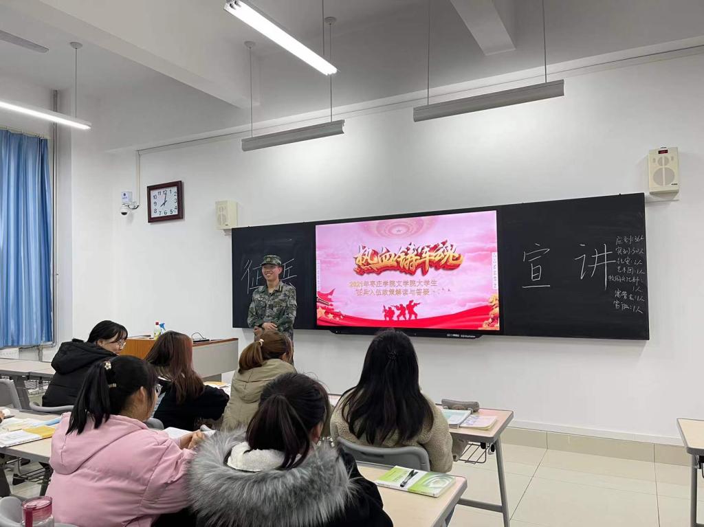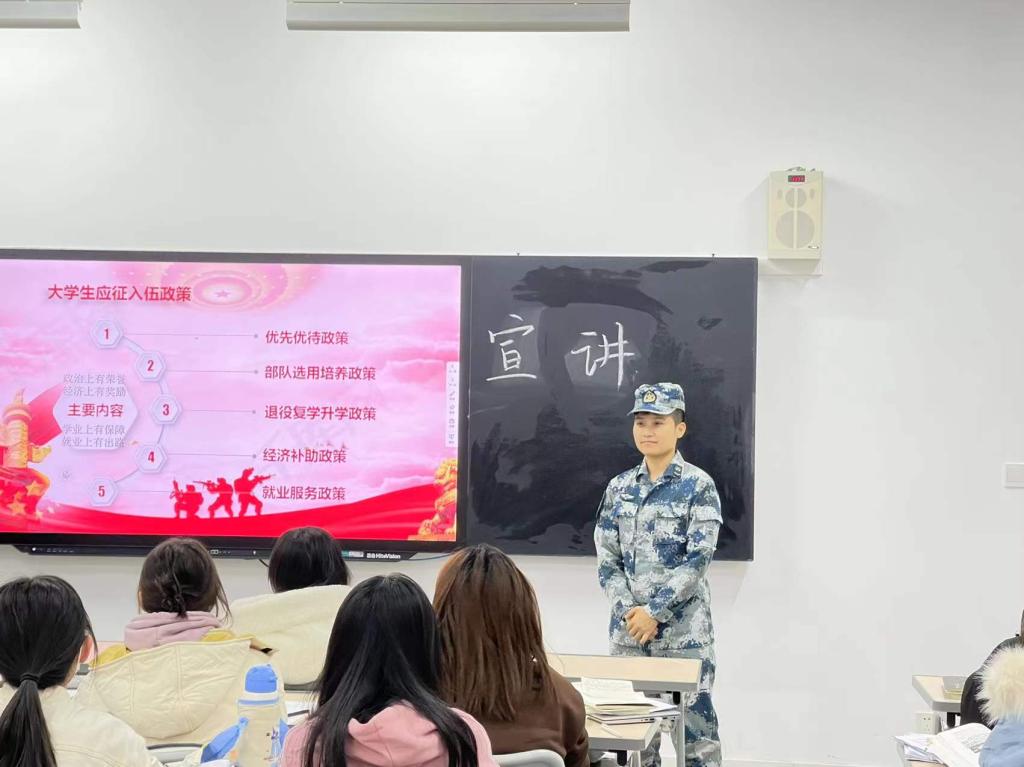 为贯彻落实强国强军思想,提升大学生国防意识,11月23日晚,PA视讯集团网站在各班进行参军入伍政策宣讲。此次宣讲由PA视讯集团网站退役大学生士兵、新校区教官卢萍、刘家名、赵阳和王华勇主讲,PA视讯集团网站21级全体学生到场参加。