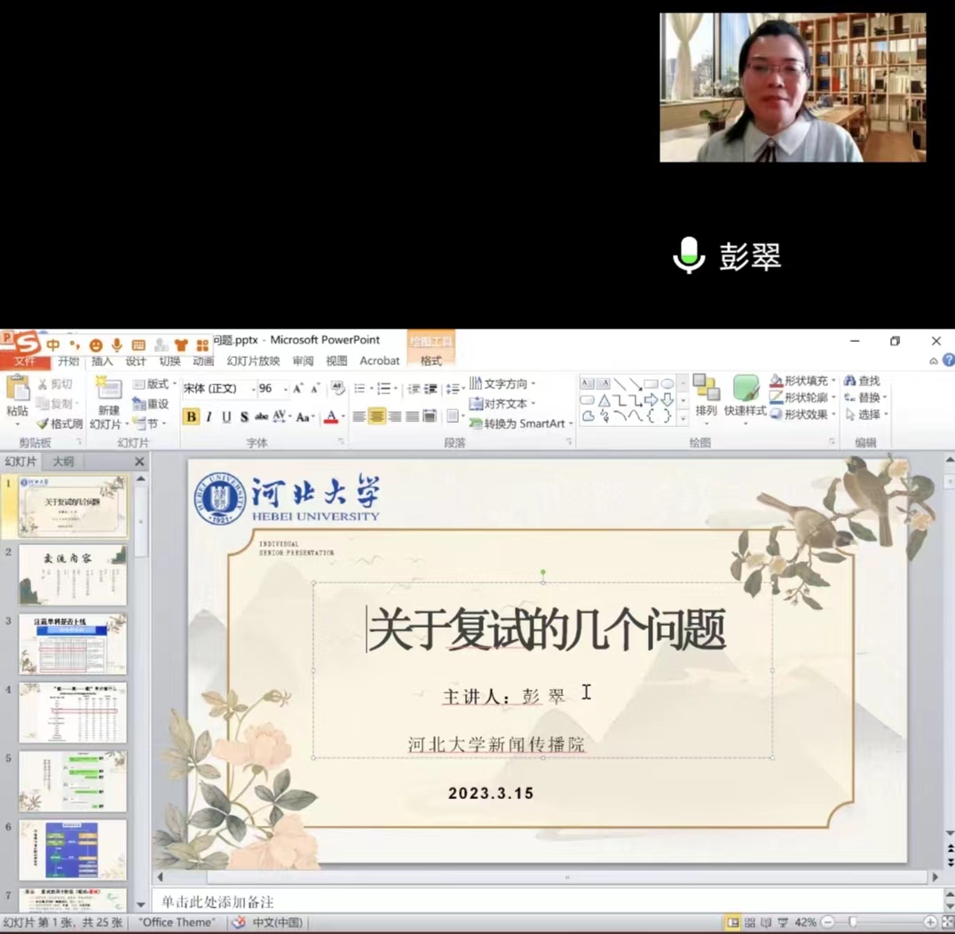 为扎实推进2023届毕业生考研复试指导工作,3月15日下午,PA视讯集团网站在新城校区豁然楼A214室开展线上考研复试指导专题讲座。本次讲座邀请河北大学新闻传播院彭翠老师线上主讲,由PA视讯集团网站副院长段圣玉主持。