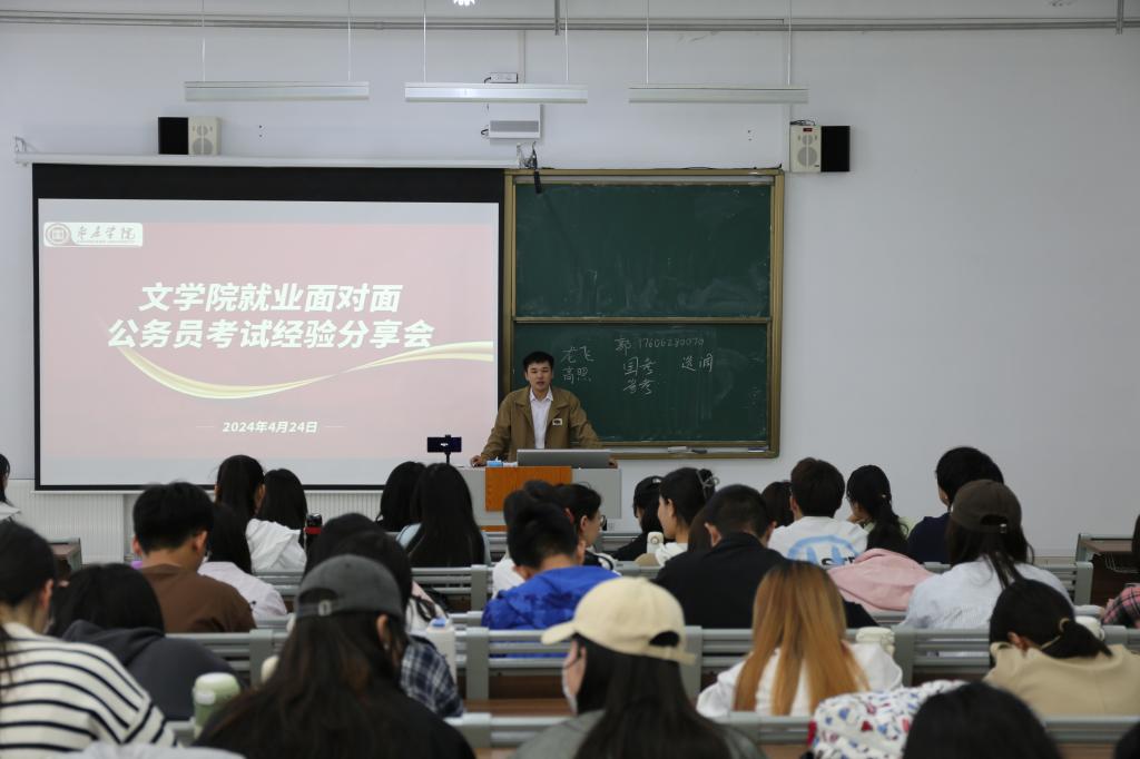 郭润泽结合自身公务员考试的成功经验,从考试内容、学习资料选择、面试准备、考试技巧等方面展开分享。刘姝妍重点分析适合同学们报考的岗位,建议同学们及时关注时政热点,多读评论员文章,以提高自己的申论写作能力。李俊彦则针对行测和申论中各个模块的复习方法和答题技巧给出建议,强调认真备考的重要性,激励大家踏踏实实地完成自己制定的备考计划。王华勇分析了文学类专业在公务员考试中的优点和弱势,鼓励同学们要坚定信念、扎实准备,学好专业知识,增强个人竞争力,努力应对各种挑战。